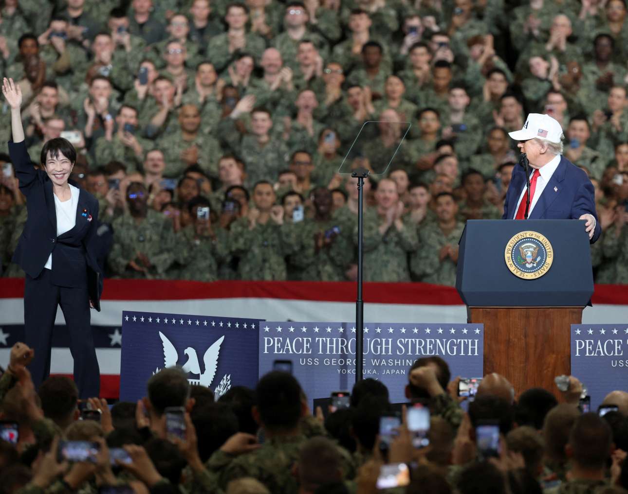 Στη πήρε τον λόγο η Τακαΐτσι: «Πριν από έξι χρόνια, στο ίδιο ακριβώς σημείο, ο αείμνηστος πρωθυπουργός Σίνζο Αμπε και ο πρόεδρος Τραμπ στάθηκαν πλάι πλάι και διακήρυξαν την αποφασιστικότητά τους πως η Ιαπωνία και οι Ηνωμένες Πολιτείες θα ενώσουν τα χέρια για να διασφαλίσουν την ειρήνη και την ασφάλεια στην περιοχή».