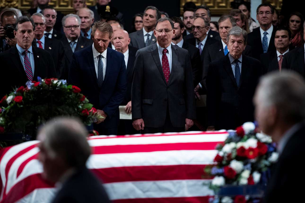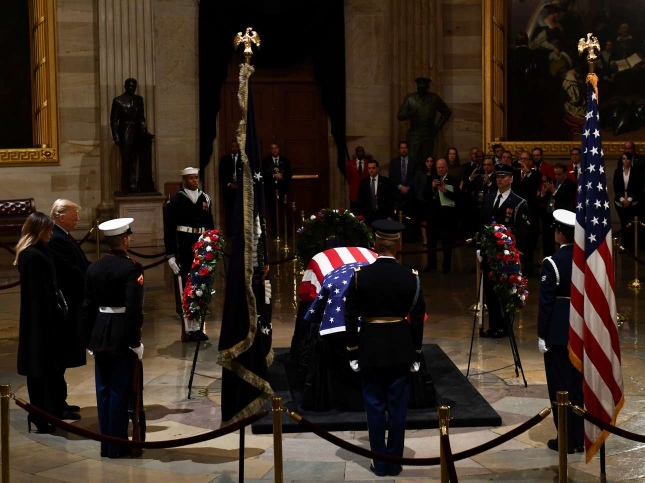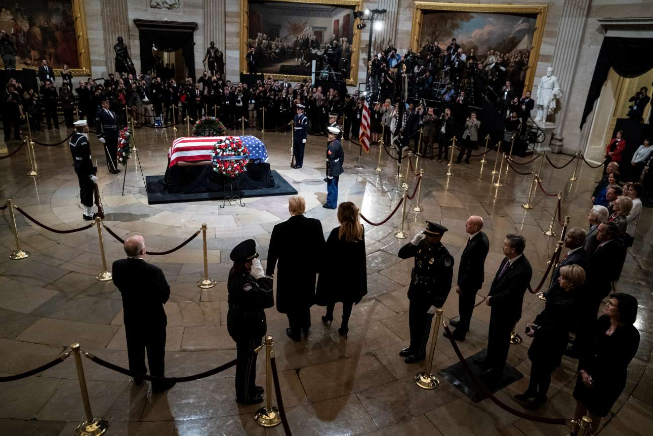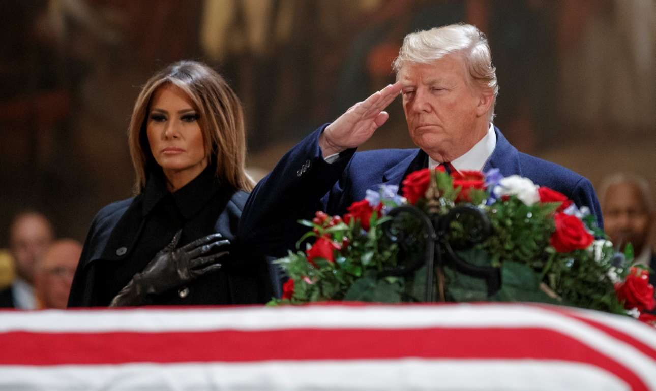Ο Ντόναλντ Τραμπ και η σύζυγός του Μελάνια εισήλθαν στο Καπιτώλιο το βράδυ της Δευτέρας και στάθηκαν μπροστά στο φέρετρο του πρώην προέδρου των ΗΠΑ, το οποίο σκεπάζει η αμερικανική σημαία. Ο πρόεδρος χαιρέτισε στρατιωτικά και στη συνέχεια το προεδρικό ζεύγος αποχώρησε.