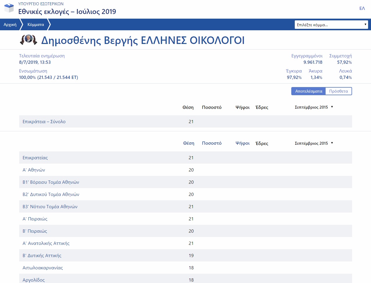 Οι Ελληνες Οικολόγοι γίνονται έτσι το μοναδικό από τα 21 κόμματα, που κατέβηκαν υποψήφια, που δεν πήρε ούτε μία ψήφο. Κατά πάσα πιθανότητα δεν τύπωσε καν ψηφοδέλτια…