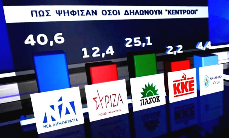 -Οι κεντρώοι ψηφοφόροι σε ποσοστό 40,6% προτίμησαν τη ΝΔ και μόλις το 12,4% τον ΣΥΡΙΖΑ. Το ΠΑΣΟΚ συγκέντρωσε το 25,1% και το ΚΚΕ μόλις 2,2%. «Η περίφημη μάχη για το Κέντρο δείχνει ξεκάθαρα τη διείσδυση που έχει πετύχει η Νέα Δημοκρατία προς τον ενδιάμεσο ιδεολογικό χώρο», ανέφερε ο αναλυτής.