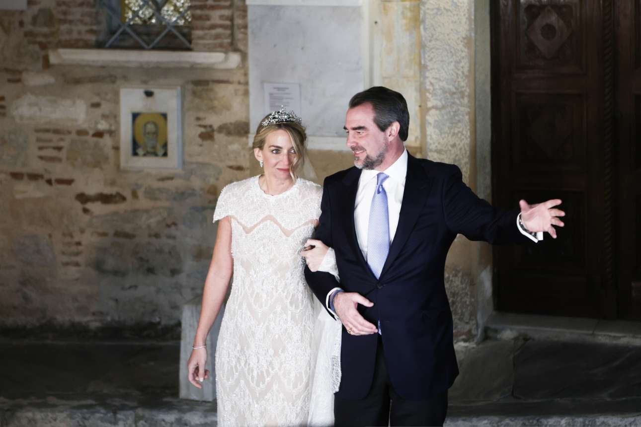 Ήταν πιο εντυπωσιακή από ποτέ και έλαμπε από χαρά. Η νύφη επέλεξε ένα δαντελένιο νυφικό σε ίσια γραμμή κεντημένο με κρύσταλλα, του γνωστού έλληνα σχεδιαστή Χρήστου Κωσταρέλλου. Τα μαλλιά της ήταν πιασμένα χαλαρά και διακοσμημένα με μια τιάρα από τη συλλογή της τέως βασίλισσας Αννας Μαρίας. Την εμφάνισή της συμπλήρωσε με ένα μακρύ πέπλο με λεπτομέρειες από χειροποίητη δαντέλα. Η νυφική ανθοδέσμη που κρατούσε ήταν από τα αγαπημένα λουλούδια της ‘Αννας Μαρίας, τα μιγκέ.