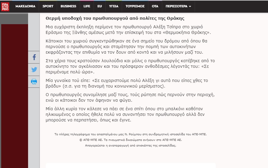 Το ρεπορτάζ περιλαμβάνει από αγκαλιές και λουλούδια μέχρι πλήθος ενθουσιασμένων πολιτών οι οποίοι μάλιστα σταμάτησαν την αυτοκινητοπομπή του Πρωθυπουργού, φυσικά για τον ευχαριστήσουν για το μέρισμα. Ασφαλώς υπήρξαν και οι κάτοικοι της ακριτικής περιοχής που δεν τον άφηναν (ως άλλον ροκ σταρ, έναν Ελβις της υπαίθρου μάλλον) να φύγει και το όλο σκηνικό απογειώθηκε, με την ιστορία ενός ηλικιωμένου ο οποίος -από τη σύνταξη του εν λόγω κειμένου- φαίνεται ότι ενώ δεν μπορούσε να περπατήσει για να τον συναντήσει, τελικά σηκώθηκε στα πόδια του, χάρη στον κ. Τσίπρα! Προφανώς κάτι άλλο ήθελε να πει ο συντάκτης αλλά μάλλον παρασύρθηκε. Αλλωστε ο κ. Τσίπρας περιγράφεται λίγο ως πολύ, ως Μεσσίας.