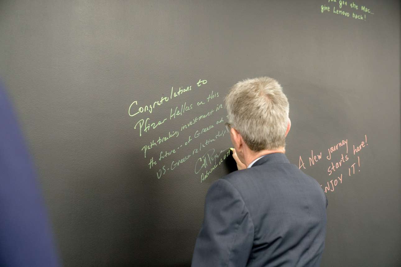 O κ. Πρέσβης των ΗΠΑ, συνοδευόμενος από τον Πρόξενο κ. Πφλέγκερ, ξεναγήθηκε στους χώρους του Τεχνολογικού Κέντρου από τον επικεφαλής του κ. Nico Gariboldi και τον Διευθύνοντα Σύμβουλο της Pfizer Hellas Α.Ε., Ζαχαρία Ραγκούση ενώ ενημερώθηκε για την πορεία της επένδυσης, το έργο και τις δραστηριότητες του Κέντρου.