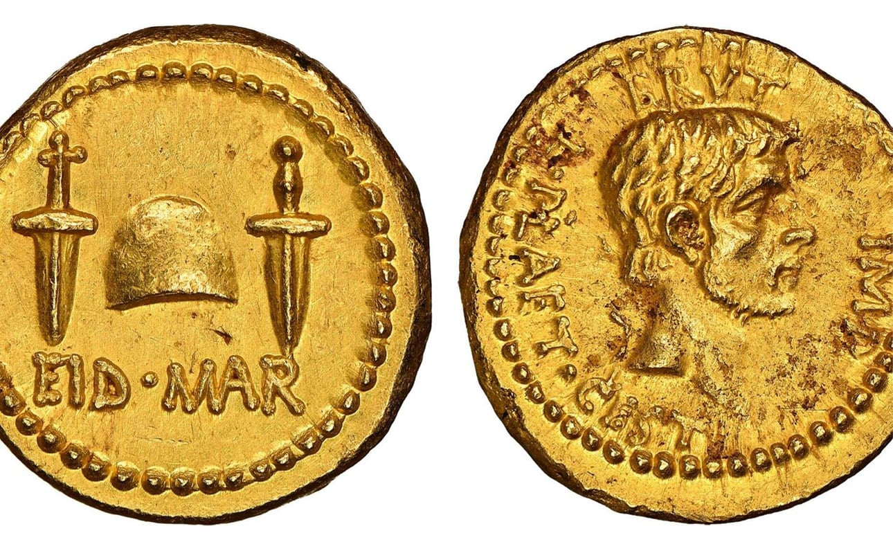 Φτιαγμένο δύο χρόνια μετά τη δολοφονία του Ιούλιου Καίσαρα, το 42 π.Χ, το χρυσό αρχαίο νόμισμα φέρει στην εμπρόσθια όψη την κεφαλή του Βρούτου και στην οπίσθια τα όπλα της δολοφονίας του Ιουλίου Καίσαρα. Η επιγραφή «Eid – Mar» παραπέμπει στις Ειδούς του Μαρτίου, την ημέρα δολοφονίας του Ιουλίου Καίσαρα.