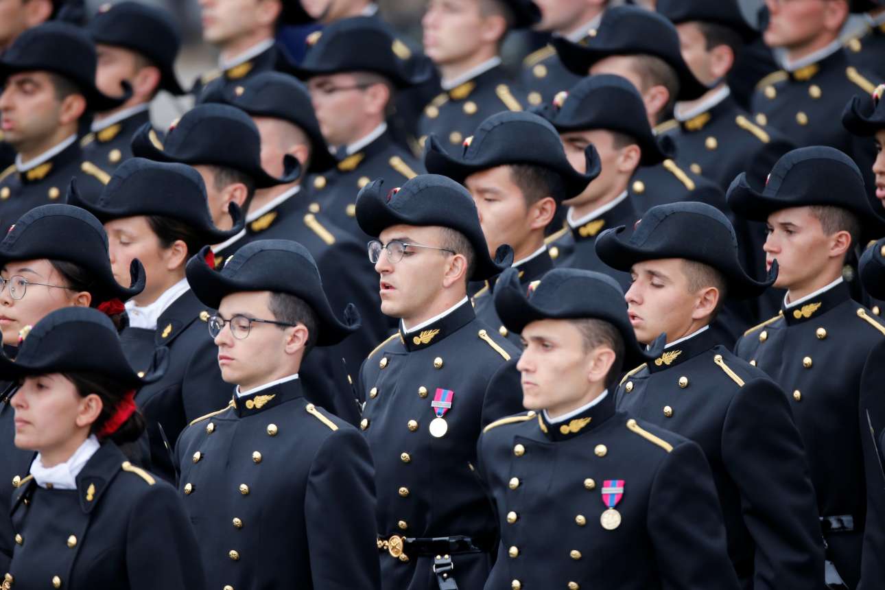 Ο Εμανουέλ Μακρόν έφτασε στην παρέλαση πάνω σε στρατιωτικό όχημα, ενώ στην εξέδρα μαζί του, κάθισε η Ανγκελα Μέρκελ.