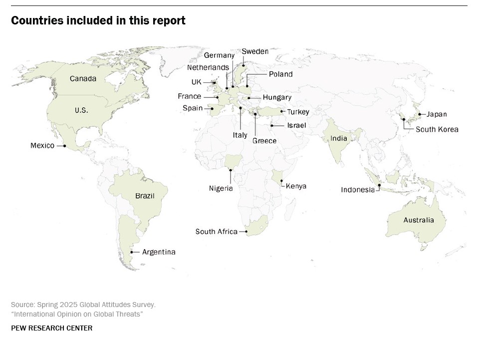 Το 67% θεωρεί την κλιματική αλλαγή μείζονα απειλή, ενώ 24% τη θεωρεί μικρή και 9% καθόλου. Σε καμία χώρα της έρευνας η κλιματική αλλαγή δεν εμφανίζεται ως η κορυφαία απειλή. Ωστόσο, οι ανησυχίες γι’ αυτήν είναι υψηλότερες από ό,τι το 2013, τόσο σε προηγμένες όσο και σε χώρες μεσαίου εισοδήματος.