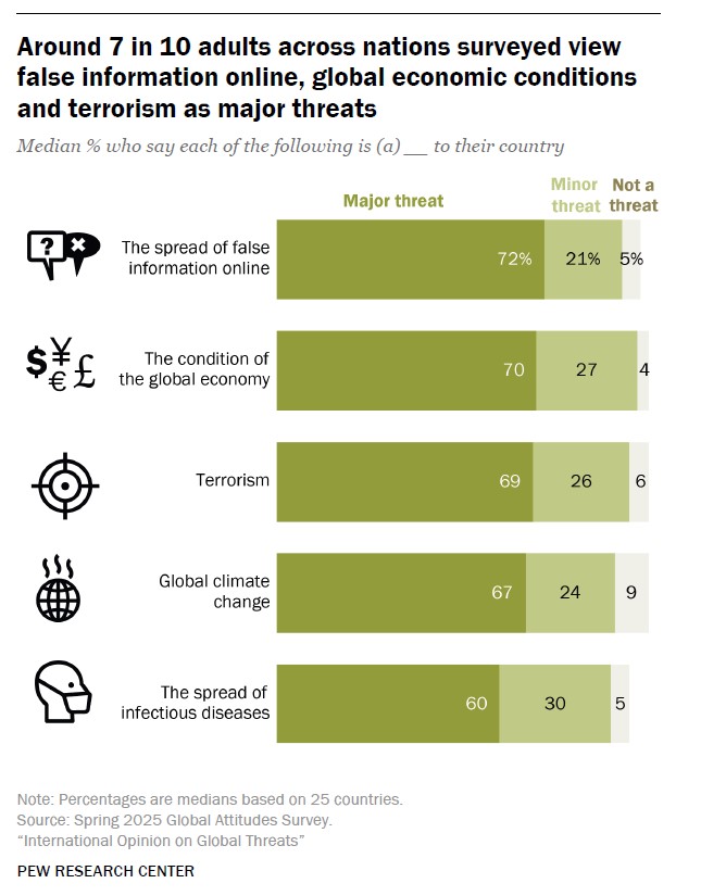 Σύμφωνα με την τελευταία έρευνα του Pew Research Center, αναφορικά με το τι φοβούνται περισσότερο οι πολίτες 25 χωρών, την πρώτη τριάδα αυτών των ανησυχιών καλύπτουν τα εξής: η διάδοση ψευδών πληροφοριών στο διαδίκτυο, η κατάσταση της παγκόσμιας οικονομίας και η τρομοκρατία.