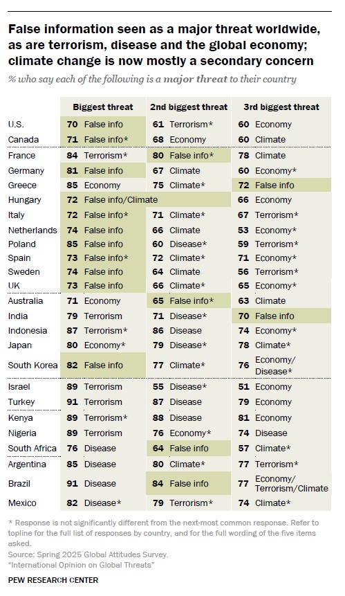 Σε επτά χώρες — Γερμανία, Ολλανδία, Πολωνία, Σουηδία, Ηνωμένο Βασίλειο, Ηνωμένες Πολιτείες και Νότια Κορέα — περισσότεροι πολίτες βλέπουν τη διάδοση ψευδών πληροφοριών ως κορυφαία απειλή σε σχέση με κάθε άλλο ζήτημα που εξετάστηκε. Οι Γερμανοί και οι Πολωνοί, οι οποίοι συμμετείχαν σε εθνικές εκλογές τον τελευταίο χρόνο, βλέπουν αυτήν την απειλή ως την πιο σημαντική με μεγάλη διαφορά.