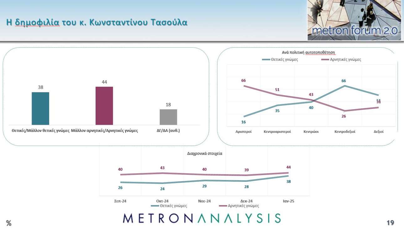 Ως προς τη δημοφιλία του τέως Προέδρου της Βουλής και προτεινόμενου από τη Νέα Δημοκρατία για τη θέση του Προέδρου της Δημοκρατίας Κωνσταντίνου Τασούλα, είναι σαφές ότι οι θετικές γνώμες είναι περισσότερες από τις αρνητικές.
