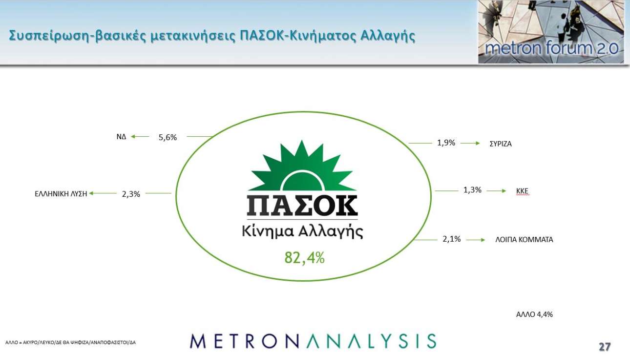 Το ΠΑΣΟΚ, με συσπείρωση 82,4%, έχει απώλειες κυρίως προς τη Νέα Δημοκρατία αλλά και την Ελληνική Λύση.