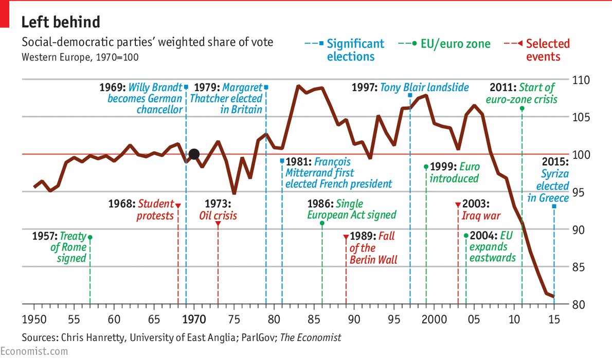 Τώρα η κατάσταση είναι αλλιώς. Τώρα έχει εξαφανιστεί σχεδόν το 1/3 της εκλογικής δύναμης του χώρου αυτού και τα ποσοστά των κομμάτων που τον απαρτίζουν σε πολλές περιπτώσεις είναι τα χαμηλότερα που έχουν επιτευχθεί ποτέ. Αποτέλεσμα; Η χειρότερη επίδοση στις κάλπες τα τελευταία 70 χρόνια. Ποτέ ξανά από τον Δεύτερο Παγκόσμιο Πόλεμο και μετά δεν έχει υπάρξει τόσο άσχημο αποτέλεσμα για τα κόμματα της Κεντροαριστεράς σε όλη την Ευρώπη.