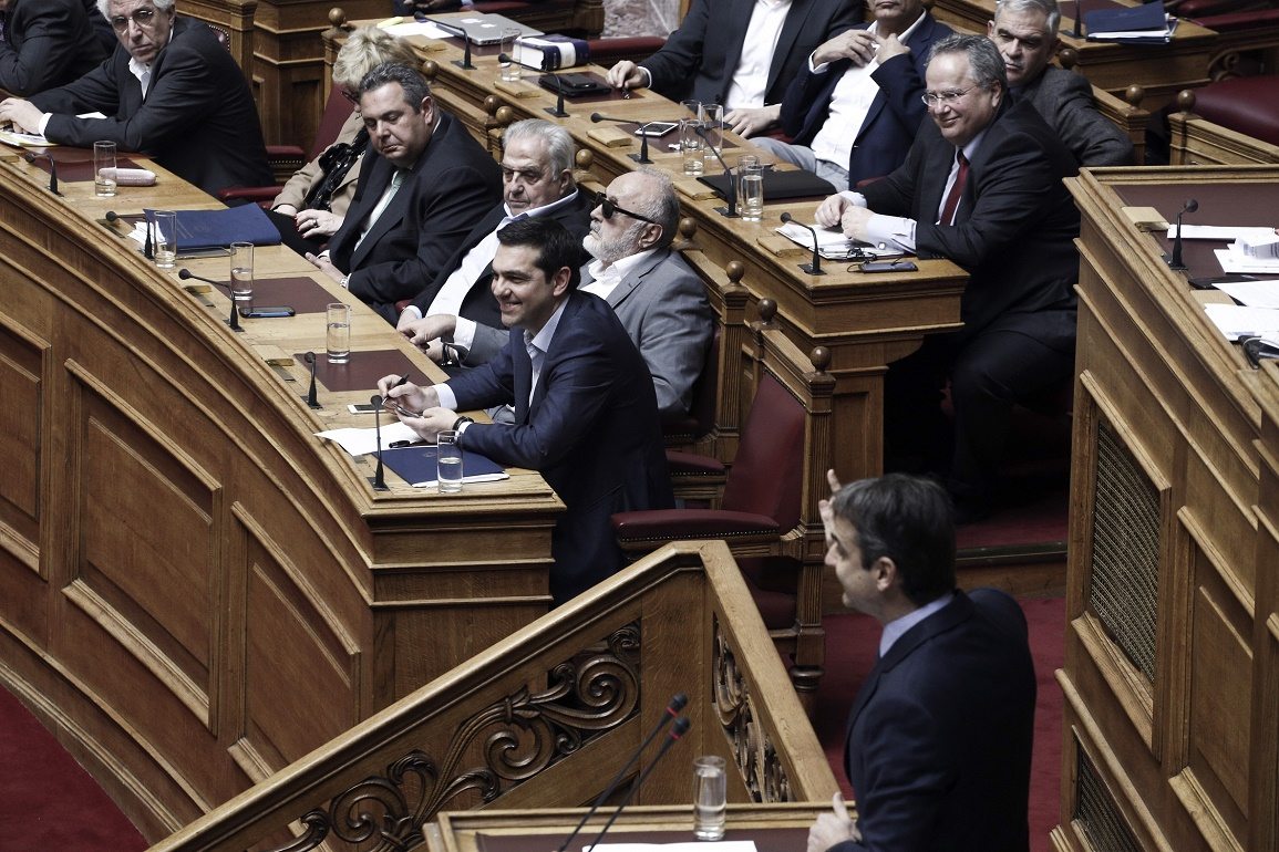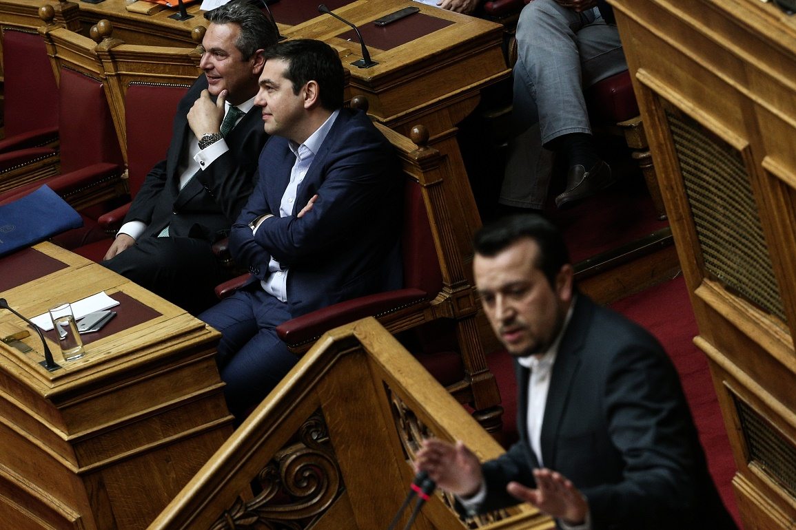 Ο υπουργός Επικρατείας παραστατικός, ο Πρωθυπουργός σε αμυντική στάση, ο Πάνος Καμμένος χαμογελά (Nick Paleologos / SOOC)