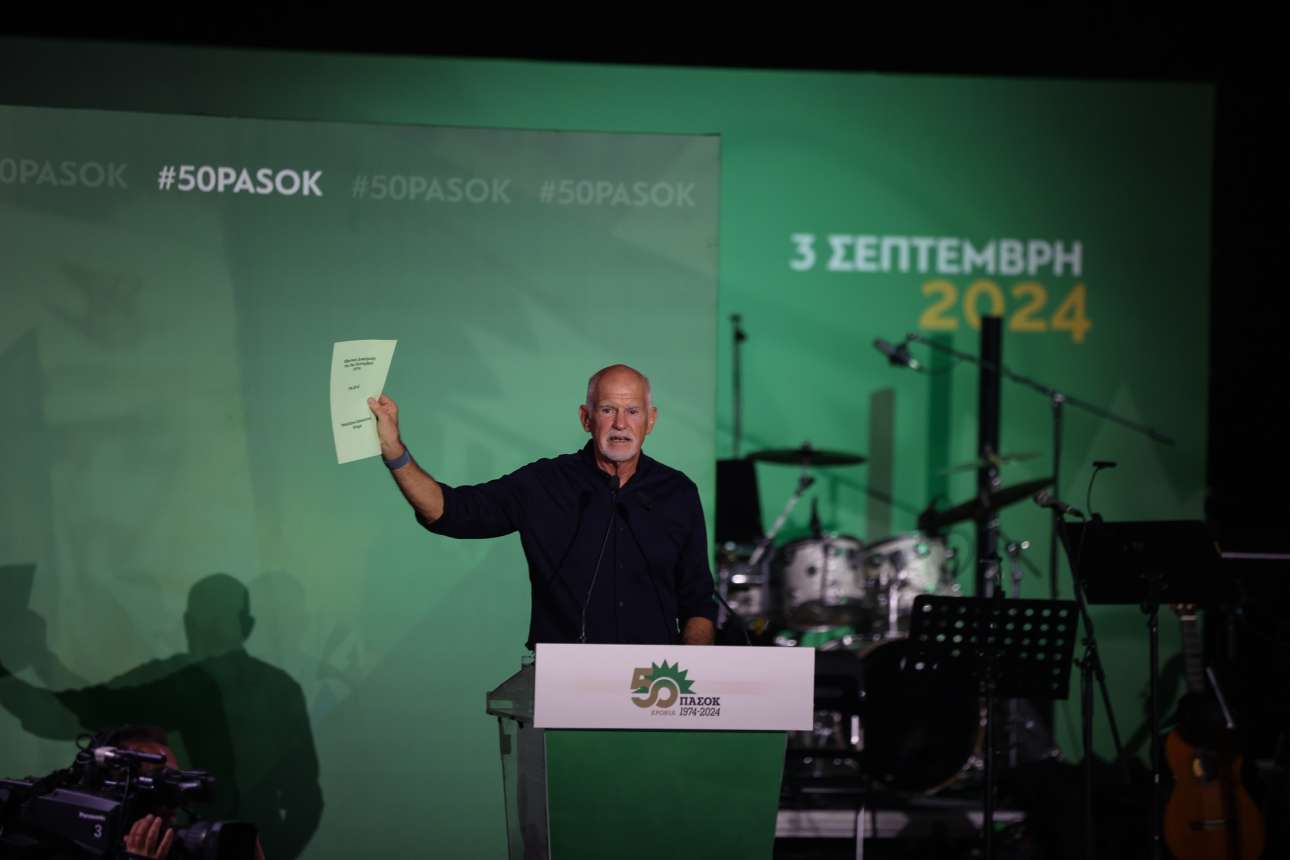 «Κυρίες και κύριοι, αγωνιστές του ΠΑΣΟΚ. Σήμερα συμπληρώνονται 50 χρόνια από την ίδρυση του ΠΑΣΟΚ. Υπήρξα συνιδρυτής του ΠΑΣΟΚ την 3η του Σεπτέμβρη του 1974.