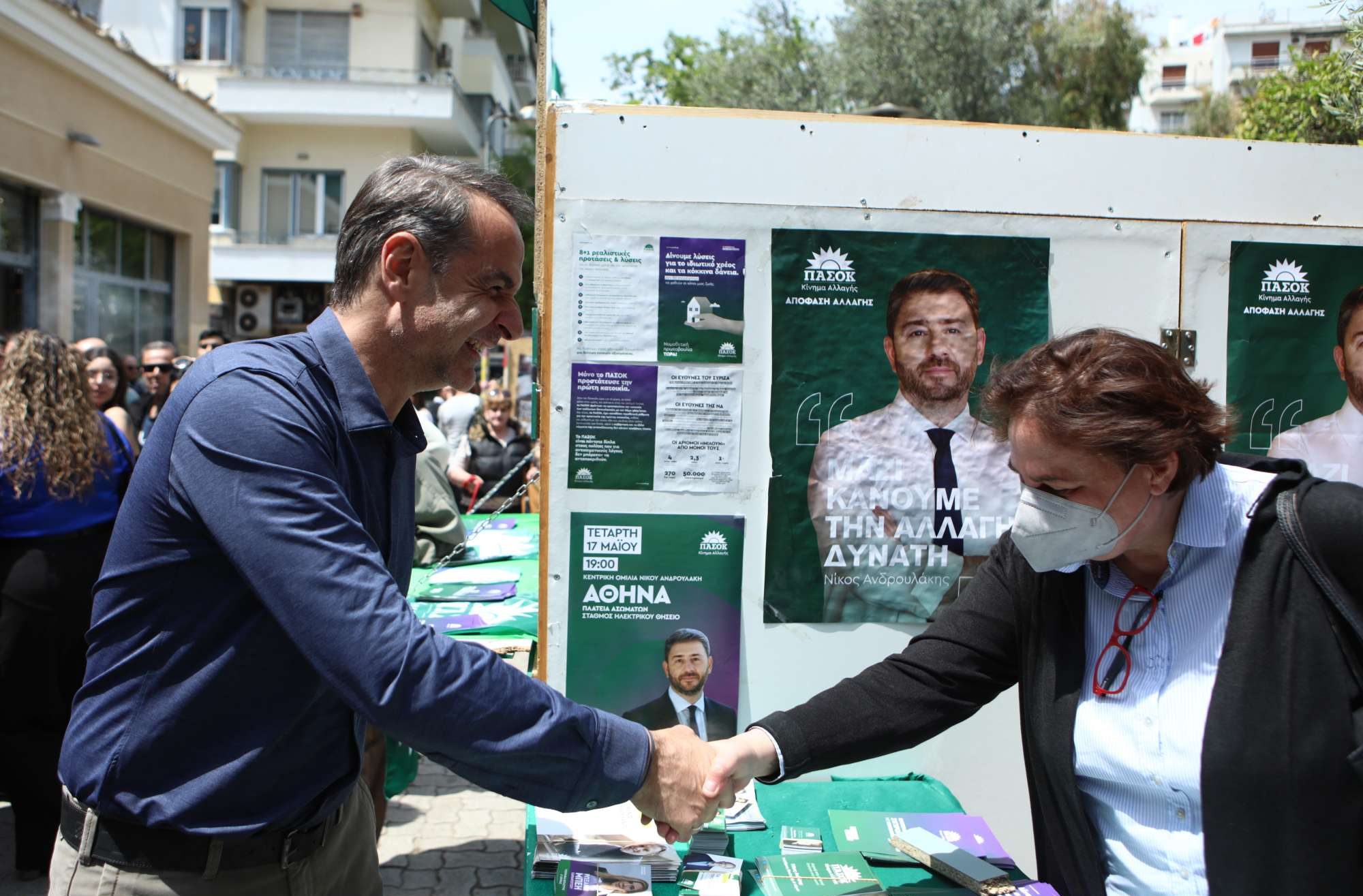 Ο Πρωθυπουργός επισκέφθηκε και το προεκλογικό περίπτερο του ΠΑΣΟΚ-ΚΙΝΑΛ, λίγα μέτρα παρακάτω.