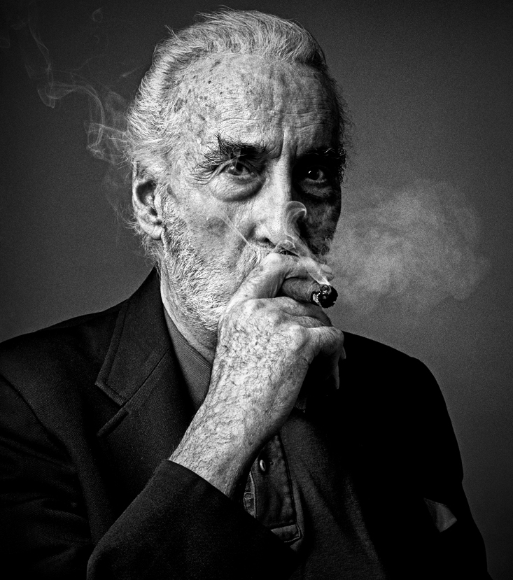 «Φωτογράφισα τον Κρίστοφερ στο ξενοδοχείο “Savoy”, στο Λονδίνο. Ανυπομονούσα για αυτή τη φωτογράφιση για διάφορους λόγους, αλλά νομίζω ότι το κυριότερο ήταν ότι ο Κρίστοφερ έπαιξε σε περισσότερες ταινίες από οποιονδήποτε άλλον στην ιστορία, πάνω από 220. Είχα μιλήσει μαζί του πολλές φορές στο τηλέφωνο, είχε μια πολύ βαθιά μονότονη φωνή σαν διευθυντής και δεν μπορούσα παρά να νιώθω σαν μαθητής, και (για κάποιο μανιακό λόγο) κατέληξα να απαντώ σε κάθε ερώτηση με ένα “ναι κύριε”. Είχα τον εξοπλισμό μου έτοιμο όταν ο Κρίστοφερ κάθισε στη θέση του και άρχισε να ρουφάει ένα μεγάλο πούρο. Ηταν συναρπαστικό να τον ακούς να απαρνείται ιστορίες από τις παλιές εποχές του κινηματογράφου και την κορυφαία του ταινία “Το Καταραμένο Σκιάχτρο” (“The Wicker Man”, 1973), αν και το πρόσωπό του άρχισε να παραμορφώνεται όταν ανέφερε ότι πρόκειται να το ξαναφτιάξουν. Θα μπορούσα να ακούω τις ιστορίες του με μεγάλη χαρά όλη μέρα, αλλά καθώς πλήρωνα τον χρόνο αναμονής ενός αυτοκινήτου που θα τον πήγαινε στο σπίτι του, δεν το έκανα. Καθώς περπατούσαμε μαζί στους διαδρόμους του “Savoy”, εντόπισε τις παρτιτούρες της κωμικής όπερας “Ο Μικάδος” (1885) των Γκίλμπερτ και Σάλλιβαν. Με κοίταξε με μια αγορίστικη λάμψη στα μάτια και μου είπε ότι τραγουδάει καθημερινά…και τότε ο χώρος γέμισε με τη φωνή του καθώς ερμήνευε το “Τρεις μικρές υπηρέτριες” (“Three Little Maids”)».
