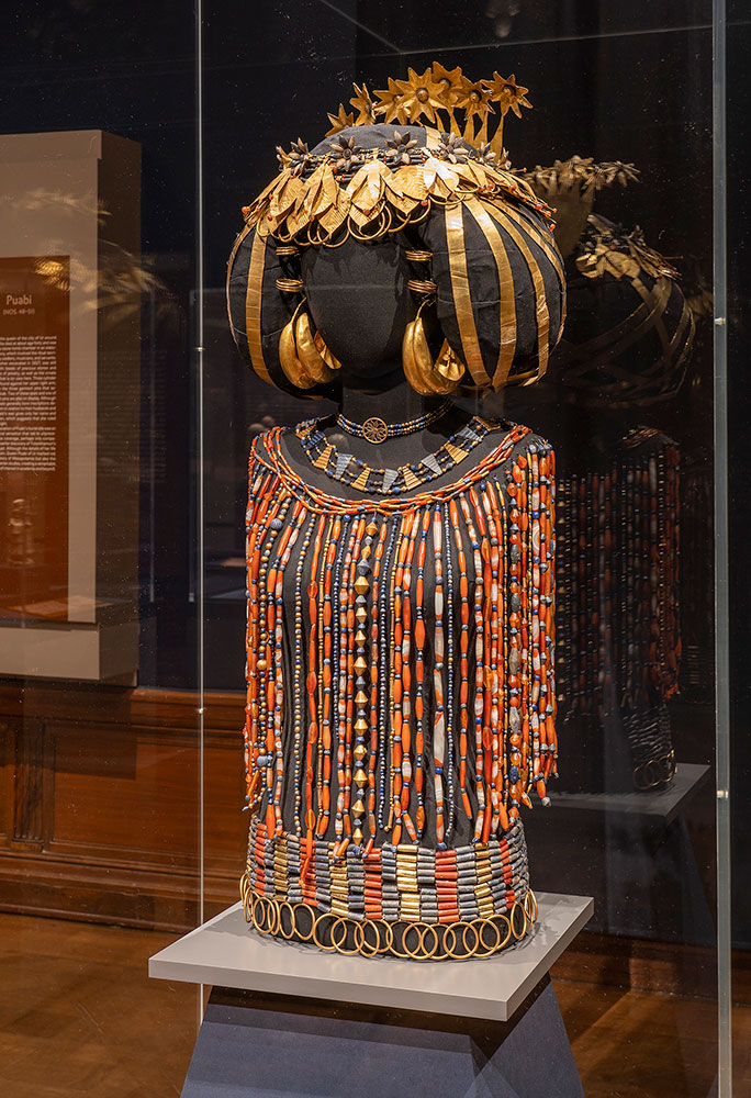 Το κεντρικό στοιχείο της έκθεσης είναι το εκπληκτικό πολύχρωμο ταφικό σύνολο της βασίλισσας Πουάμπι των Σουμερίων, της δυναστείας των Ουρ, που έζησε γύρω στο 2500 π.Χ., περίπου 150 χρόνια πριν από την Ενεντουάννα, και για πρώτη φορά στην Ιστορία έβαψε κόκκινα τα χείλη της. Οπως αρμόζει σε μια βασίλισσα, η υπέροχη κόμμωσή της αποτελείται από σφυρήλατα φύλλα και κορδέλες από χρυσό, καθώς και στρογγυλές χάντρες από λάπις λάζουλι και καρνελιάνα.