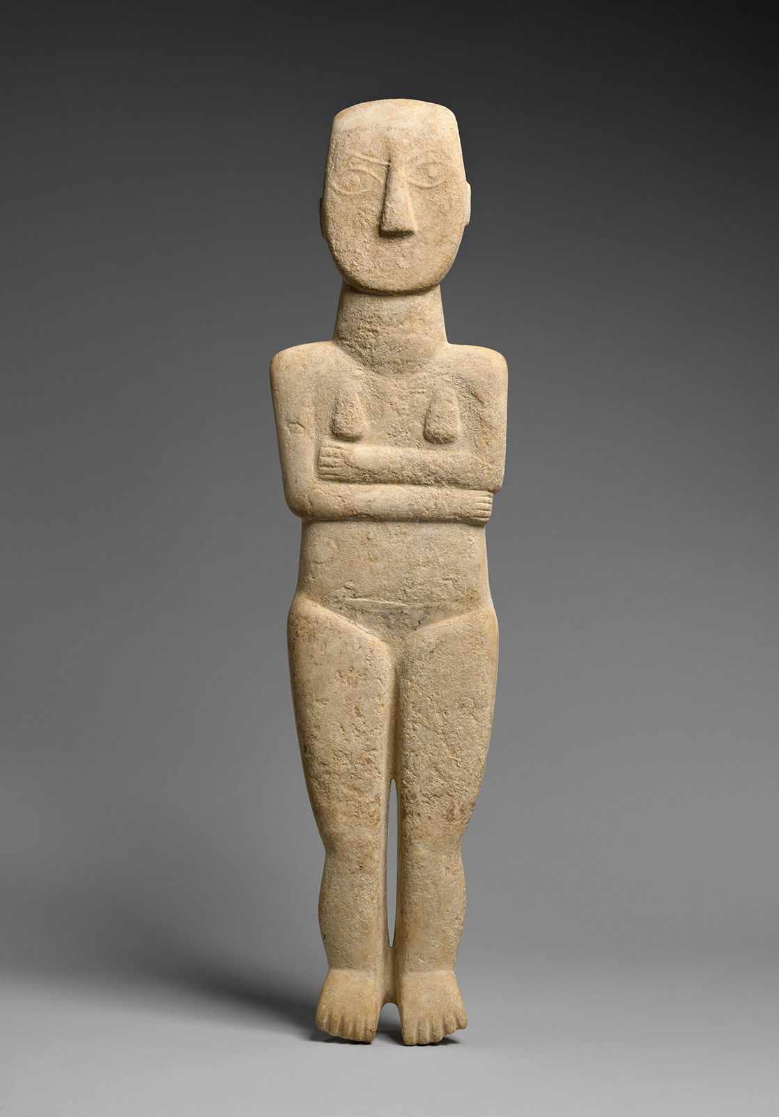 Πέντε μεγάλες βιτρίνες, συνήθως με τρία ζεύγη ραφιών η καθεμία, καλύπτουν τον τοίχο της αίθουσας «Belfer Court», με το εσωτερικό τους, επενδυμένο με κόκκινη τσόχα, να αναδεικνύει το αστραφτερό λευκό μάρμαρο των πολύτιμων εκθεμάτων. Στα ράφια κυριαρχούν περίπου 70 μικρά γυναικεία ειδώλια ύψους κατά μέσο όρο περίπου 40 εκ. – εκτός από το σπάνιο κομμάτι, που φτάνει λίγο πάνω από το 1,22 μ.