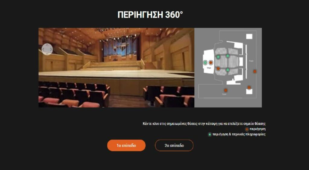 Σε ό,τι αφορά τους ενδιαφερόμενους για εισιτήρια, η δυνατότητα θέασης σε οπτική 360ο από κάθε θέση είναι διαθέσιμη κατά την επιλογή θέσης πριν την αγορά του εισιτηρίου, στην ηλεκτρονική πλατφόρμα αγοράς εισιτηρίων του Μεγάρου, π.χ. στον παρακάτω σύνδεσμο: