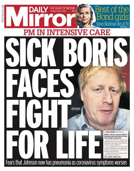 Η Daily Mirror με τίτλο «Ο άρρωστος Μπόρις δίνει μάχη για τη ζωή του» αναφέρεται στις ανησυχίες ότι ο πρωθυπουργός έχει πνευμονία, καθώς επιδεινώθηκαν τα συμπτώματα.