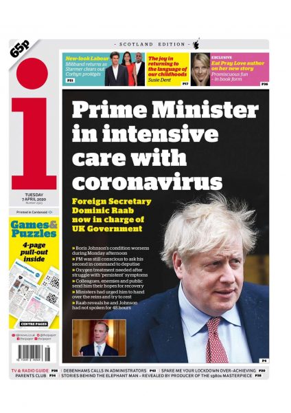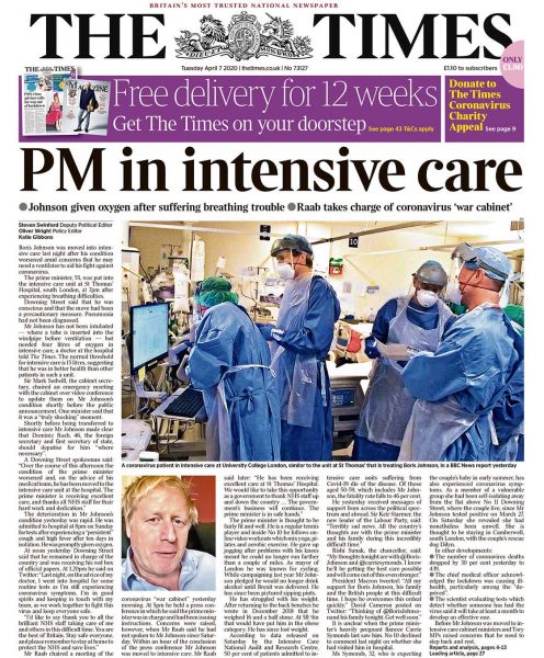 «Ο πρωθυπουργός στην Εντατική» είναι ο τίτλος των Times, που γράφουν ότι χορηγήθηκε στον Τζόνσον οξυγόνο εξαιτίας δυσχέρειας στην αναπνοή και ότι ο υπουργός Εξωτερικών Ντομινίκ Ράαμπ αναλαμβάνει την ευθύνη του «πολεμικού συμβουλίου» για τον κορονοϊό. Η εφημερίδα επικαλείται πληροφορίες γιατρού από το νοσοκομείο «Σεντ Τόμας», όπου νοσηλεύεται ο πρωθυπουργός, σύμφωνα με τον οποίο ως αργά το βράδυ της Δευτέρας δεν είχε διασωληνωθεί, ενώ του χορηγήθηκαν τέσσερα λίτρα οξυγόνο με μάσκα, αρκετά λιγότερα από την ποσότητα που χορηγείται στις ΜΕΘ. Η εφημερίδα δημοσιεύει επίσης αντιδράσεις του πολιτικού κόσμου που χαρακτηρίζει την ανακοίνωση της επιδείνωσης της κατάστασης του Μπόρις Τζόνσον «σοκαριστική» στιγμή.