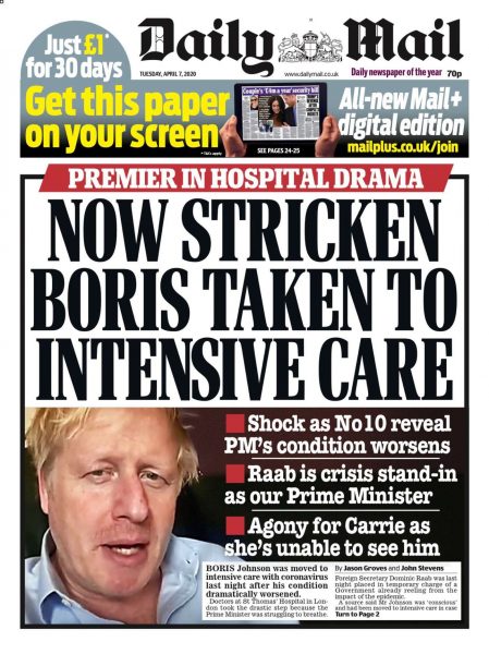 Η Daily Mail με τίτλο «Ο χτυπημένος (από τον κορονοϊό) Μπόρις μεταφέρθηκε στην Εντατική» χαρακτηρίζει «δραματική» την επιδείνωση της υγείας του πρωθυπουργού, «σοκαριστική» την αποκάλυψη και τον Ντόμινικ Ράαμπ αντικαταστάτη του για όσο διαρκεί «η κρίση».