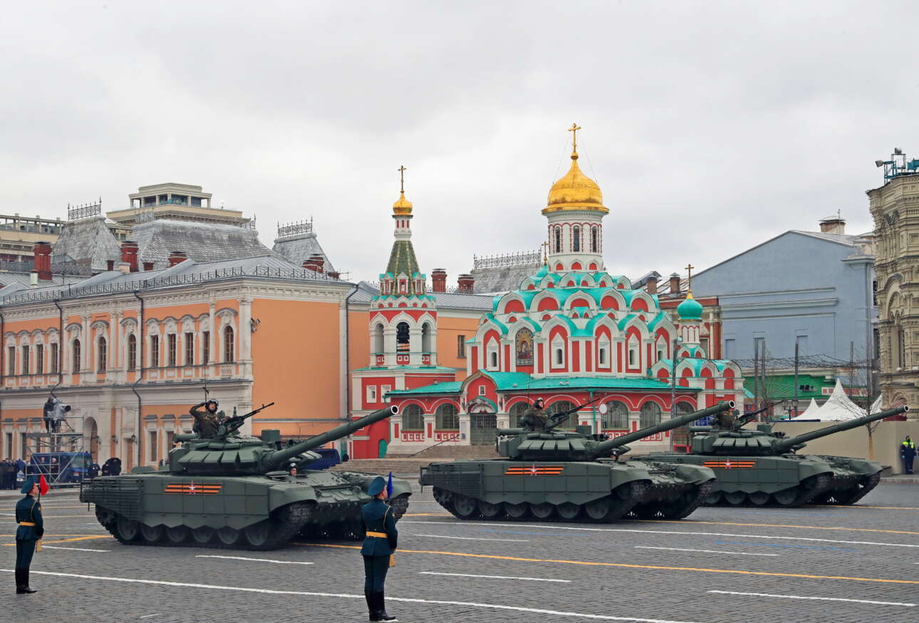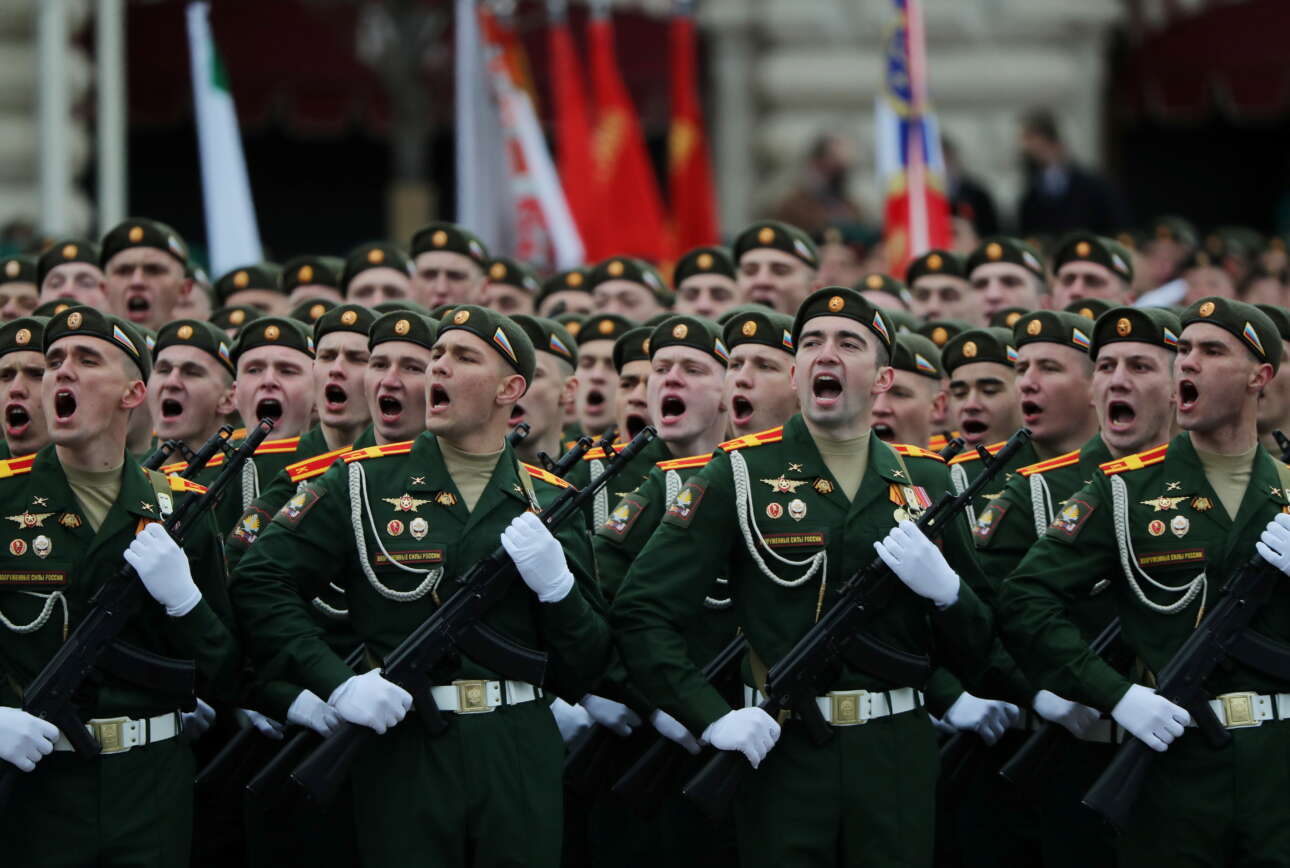 Περισσότεροι από 12.000 στρατιωτικοί, καθώς και 190 οχήματα και οπλικά συστήματα άρχισαν να παρελαύνουν στο τέλος της ομιλίας ενώπιον ενός κοινού αποτελούμενου από επισήμους και βετεράνους, γι’ αυτή την παραδοσιακή παρέλαση που σηματοδοτεί τη νίκη επί των Ναζί κατά τον Δεύτερο Παγκόσμιο Πόλεμο.