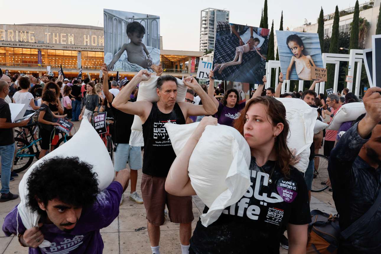 Διαδήλωση για τον τερματισμό του πολέμου και τη σίτιση των Παλαιστινίων έγινε και στο Τελ Αβίβ, με τους διαδηλωτές να φέρουν τσουβάλια αλεύρι και φωτογραφίες αποστεωμένων παιδιών της Γάζας.