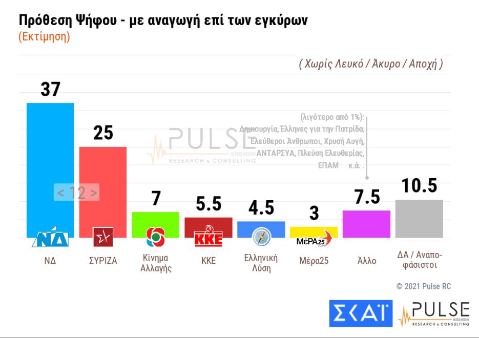 Pulse: Στο 12% η διαφορά της ΝΔ από τον ΣΥΡΙΖΑ – μειώθηκε κατά 3% σε έναν μήνα