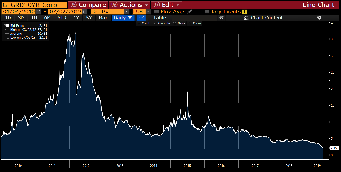 Την Τρίτη η απόδοση του ελληνικού 10ετούς ομολόγου πλησίαζε όλο και περισσότερο το 2%. Μετά το μεσημέρι διαμορφωνόταν σε νέο ιστορικό χαμηλό στο 2,11% με πτώση 25 μονάδων βάσης.