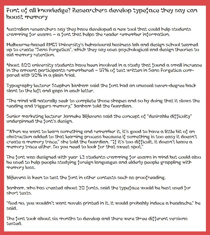 Μία κεκλιμένη αριστερά γραμματοσειρά –ηλεκτρονική, φυσικά- με γράμματα «κομμένα» σχεδίασαν αυστραλοί ερευνητές. Ισχυρίζονται ότι πρόκειται για ένα εργαλείο το οποίο θα βοηθήσει τους φοιτητές που «πήζουν» διαβάζοντας για τις εξετάσεις τους, επειδή αυτή η γραμματοσειρά βοηθά τον αναγνώστη να θυμάται ευκολότερα τις πληροφορίες.