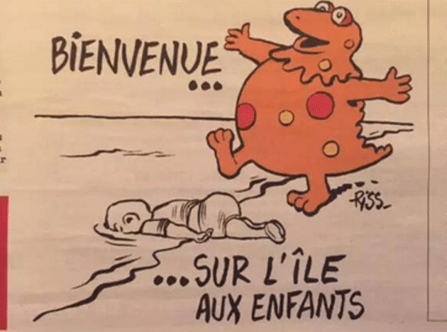 Σάλος είχε προκληθεί και με δύο ακόμη σκίτσα. Στο πρώτο, ένας γιγάντιος πορτοκαλί δεινόσαυρος καλοδέχεται τον Αϊλάν, στη νέα του… κατοικία, λέγοντάς του: «καλωσήρθες στο νησί των παιδιών».