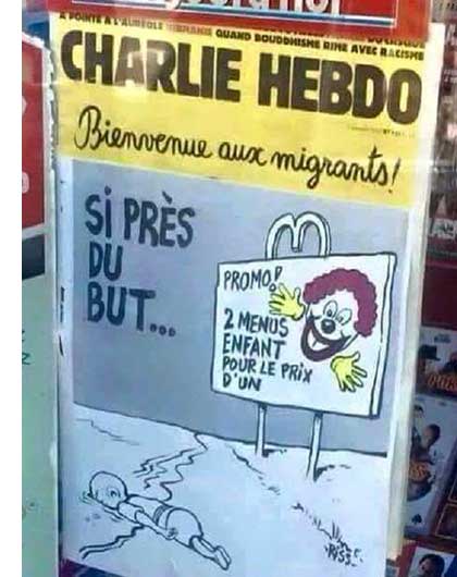 Δεν είναι η πρώτη φορά που το Charlie Hebdo ασχολείται με τον τραγικό πνιγμό του μικρού Αϊλάν. Η διάθεση και τις προηγούμενες φορές ήταν αρκούντως σατιρική, με αποτέλεσμα οι ιθύνοντες του περιοδικού να αντιμετωπίσουν νομικές κυρώσεις.