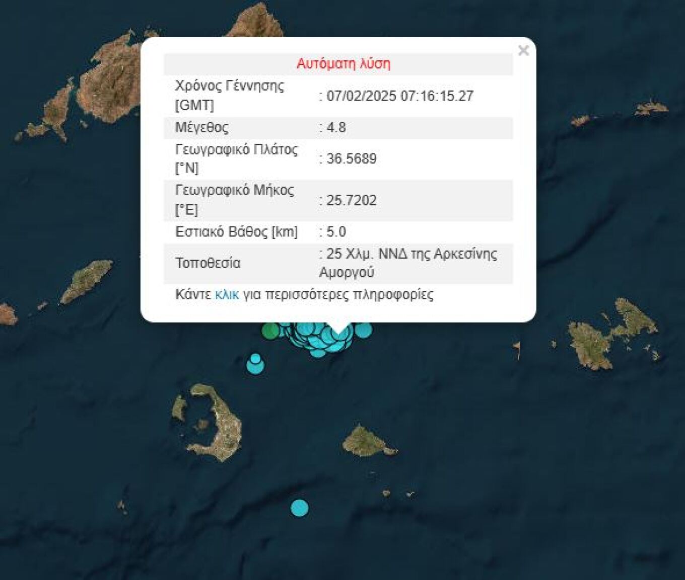 Η δόνηση, μεγέθους 4,8 βαθμών της κλίμακας Ρίχτερ, που ταρακούνησε νωρίτερα το πρωί τη Σαντορίνη, σημειώθηκε στις 9:16, είχε επίκεντρο 27 χλμ. ανατολικά-βορειοανατολικά της Οίας και εστιακό βάθος 12,3 χλμ.