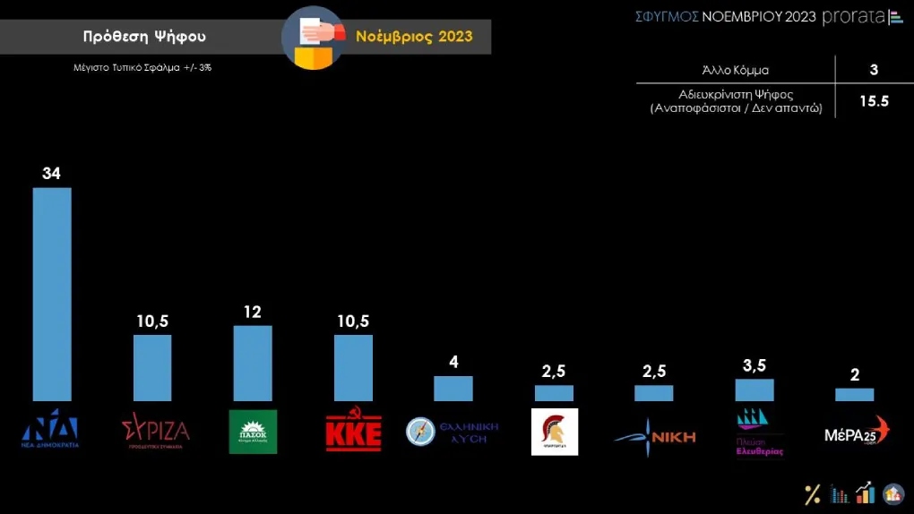 Στον «Σφυγμό» του Νοεμβρίου, την πανελλαδική έρευνα πολιτικών στάσεων και εκλογικής συμπεριφοράς της Prorata που δημοσιεύθηκε την Τρίτη, καταγράφηκαν τα εξής:
