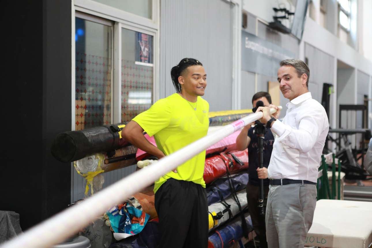 Κατά τη διάρκεια της επίσκεψης, ο κ. Μητσοτάκης τα είπε και με αθλητές που προετοιμάζονται για τους Ολυμπιακούς και Παραολυμπιακούς Αγώνες του Παρισιού και τους προπονητές τους – ανάμεσα τους και ο πολυνίκης προπονητής Γιώργος Πομάσκι (μαζί στις φωτογραφίες κάτω).