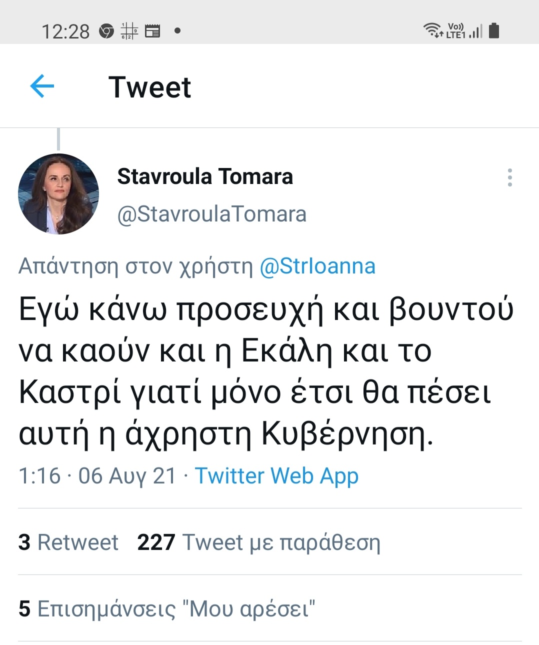 Αναλυτικότερα, σε μια εκ των αναρτήσεων της στα μέσα κοινωνικής δικτύωσης, η δικηγόρος αναφέρει χαρακτηριστικά: «Εγώ κάνω προσευχή και βουντού να καούν και η Εκάλη και το Καστρί γιατί μόνο έτσι θα πέσει αυτή η άχρηστη κυβέρνηση».