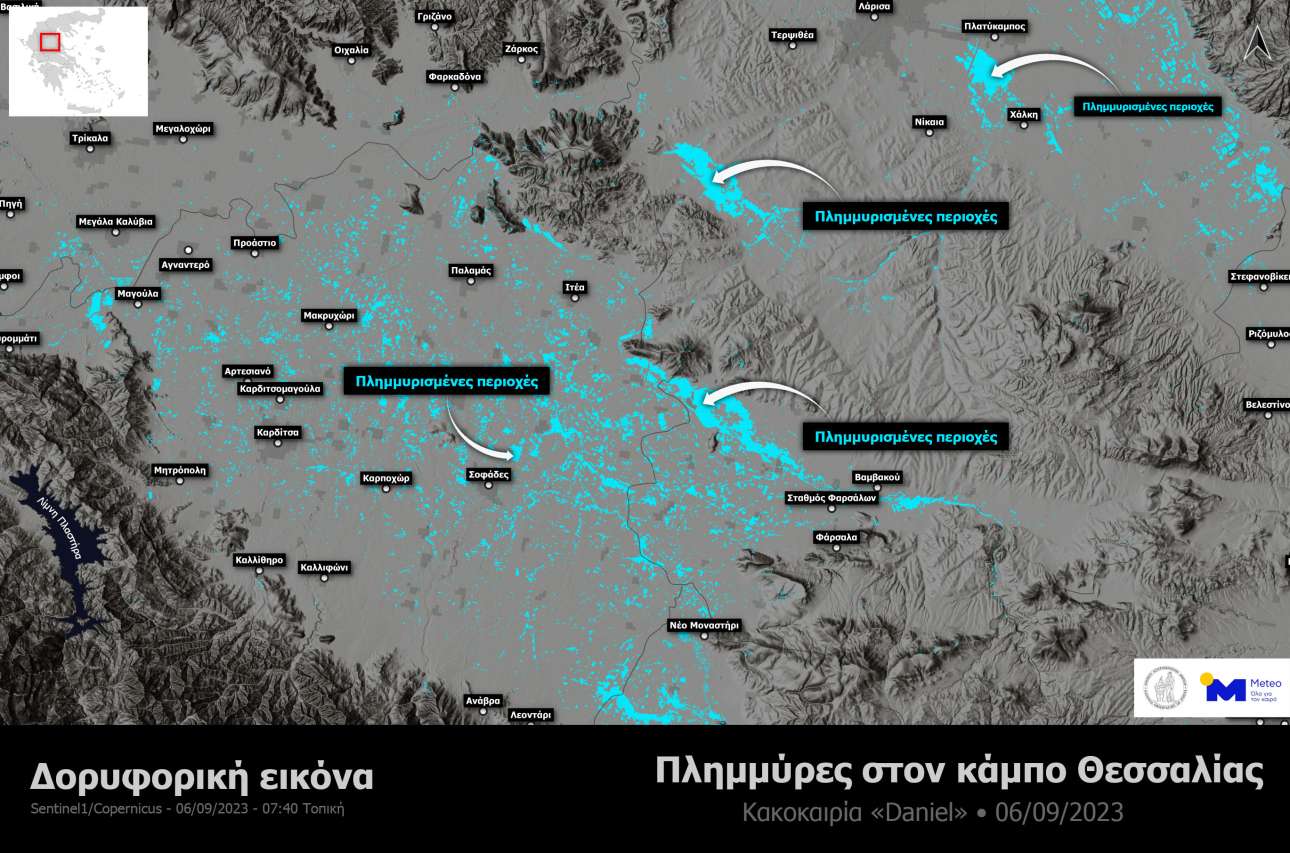 Με βάση δορυφορικά δεδομένα από το ραντάρ του ευρωπαϊκού δορυφόρου Sentinel-1 που πέρασε πάνω από τη χώρα μας το απόγευμα της Πέμπτης 7 Σεπτεμβρίου 2023, η πλημμυρισμένη έκταση εκτιμάται ότι ανέρχεται σε περίπου 720.000 στρέμματα.