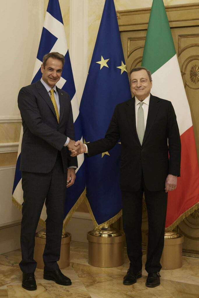 Με τον πρωθυπουργό της Ιταλίας Μάριο Ντράγκι συναντήθηκε το βράδυ της Τετάρτης ο Πρωθυπουργός Κυριάκος Μητσοτάκης, στο πλαίσιο της επίσημης επίσκεψής του στη Ρώμη, από την οποία στη συνέχεια μετέβη στις Βρυξέλλες προκειμένου να δώσει το «παρών» στη Σύνοδο Κορυφής της ΕΕ, οι εργασίες της οποίας ξεκινούν την Πέμπτη.