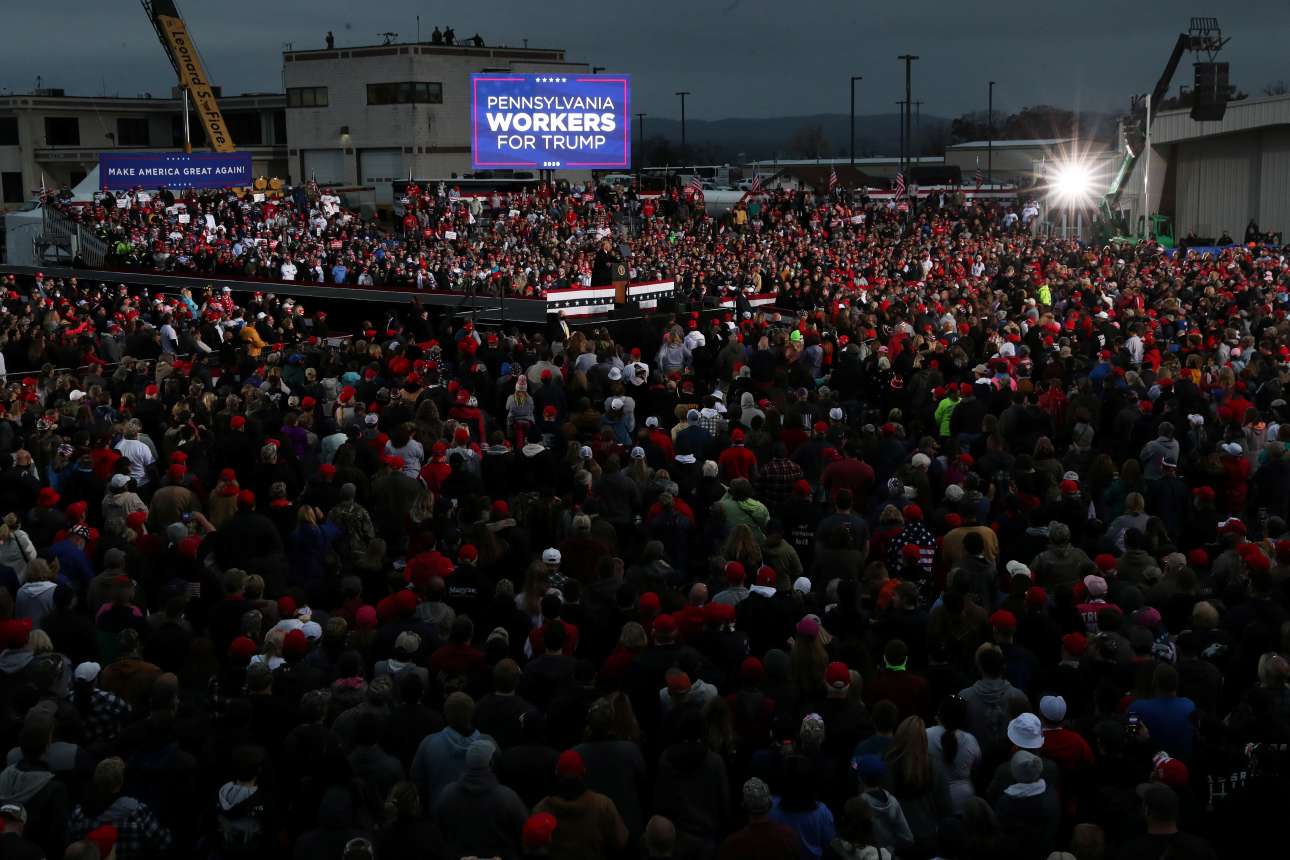 Δεν είναι τυχαίο ότι και ο Τραμπ περιόδευσε τη Δευτέρα στην Πενσιλβάνια, όπου έδωσε τρεις ομιλίες σε τρεις διαφορετικές πόλεις –λίγο προτού επιστρέψει στον Λευκό Οίκο για τη φιέστα του διορισμού της Εϊμι Μπάρετ στο Ανώτατο Δικαστήριο (εδώ) –και προσπάθησε να διαψεύσει τον προσωπάρχη του. Μιλώντας στο συγκεντρωμένο πλήθος στο Μάρτινμπεργκ, ορκίστηκε πως δεν έχει «παραδοθεί» στην πανδημία, όμως προσπάθησε να πείσει ότι «οδεύουμε να γυρίσουμε τη σελίδα». Διαμαρτυρήθηκε δε ότι τα κακά ΜΜΕ κρατούν στην επικαιρότητα την Covid-19…