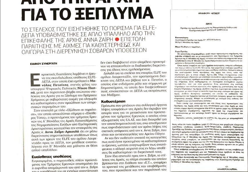 «Προκαλεί κατάπληξη το γεγονός ότι όχι μόνο με απομακρύνατε αιφνιδιαστικά από το Τμήμα Ερευνών τοποθετώντας με σε τελείως αναντίστοιχη θέση, αλλά τούτο λαμβάνει χώρα σε μία στιγμή που χειρίζομαι εξαιρετικά ευαίσθητες υποθέσεις (υπόθεση ELFE-Λαυρεντιάδη, υπόθεση πορίσματος Τραπέζης της Ελλάδος για χρηματοπιστωτικό ίδρυμα, αγοραπωλησίες ακινήτων και εισροή χρημάτων από την αλλοδαπή κ.α.), επί των οποίων τα πορίσματα της έρευνάς μου σας εισηγήθηκα».