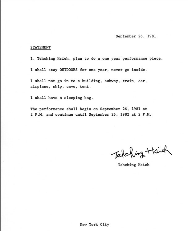 Ο Hsieh από τις 26 Σεπτεμβρίου του 1981 και για ένα χρόνο δεν μπήκε σε καμία μορφή κτιρίου. Ούτε σε είσοδο, ούτε καν κάτω από στέγαστρο, ή σε αυτοκίνητο. Γυρνούσε στους δρόμους της Νέας Υόρκης με ένα σακίδιο στην πλάτη και με ένα sleeping bag. Και ναι, έτυχε ο χειμώνας αυτός να είναι ένας από τους δριμύτερους στην ιστορία της Νέας Υόρκης.