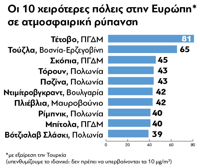 Μολυσμένο αέρα αναπνέουν στις πόλεις όπου ζουν περισσότεροι από εννέα στους δέκα κατοίκους του πλανήτη. Σύμφωνα με τον Παγκόσμιο Οργανισμό Υγείας (ΠΟΥ), 3 εκατομμύρια άνθρωποι χάνουν ετησίως τη ζωή τους, μεταξύ αυτών και 2.500 στη χώρα μας, οι οποίοι πεθαίνουν από νοσήματα όπως ο καρκίνος του πνεύμονα και τα εγκεφαλικά, εξαιτίας της ατμοσφαιρικής ρύπανσης. Αλλα 3,5 εκατομμύρια άνθρωποι σε όλο τον κόσμο πεθαίνουν επειδή αναπνέουν συνεχώς μολυσμένο αέρα μέσα στα σπίτια τους (π.χ. από ξυλόσομπες).