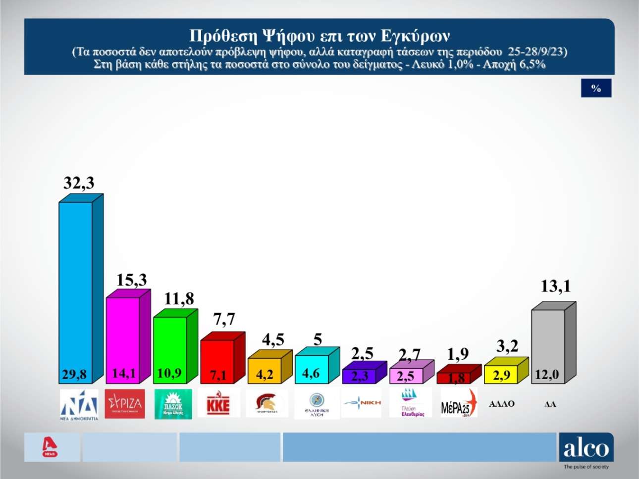 Βραδιά παρουσίασης δημοσκοπήσεων την Πέμπτη, με τις εταιρείες Pulse, Metron Analysis και Alco να δίνουν ταυτόχρονα στη δημοσιότητα τα γκάλοπ τους για λογαριασμό των καναλιών ΣΚΑΪ, Mega και Alpha, αντίστοιχα, τα οποία αποτελούν και τις πρώτες μεγάλες πανελλαδικές έρευνες της σεζόν, η οποία ξεκίνησε με το διπλό χτύπημα των έντονων καιρικών φαινομένων Daniel και Elias στη χώρα, και την εκλογή Κασσελάκη στην προεδρία του ΣΥΡΙΖΑ.