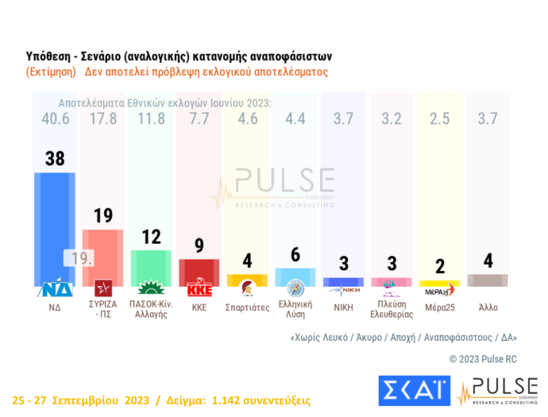 Στο σενάριο αναλογικής κατανομής των αναποφάσιστων, συγκεκριμένα, η ΝΔ συγκεντρώνει ποσοστό 38% και ο ΣΥΡΙΖΑ 19%. Ακολουθούν το ΠΑΣΟΚ με 12%, το ΚΚΕ με 9%, η Ελληνική Λύση με 6%, οι Σπαρτιάτες με 4%, ενώ από 3% συγκέντρωσαν η Νίκη και η Πλεύση Ελευθερίας.