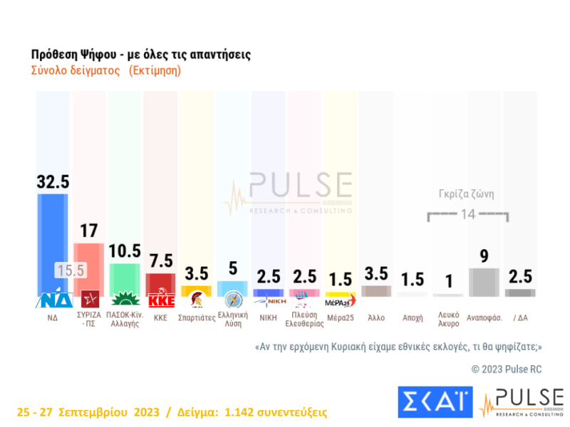 Η διαφορά της ΝΔ (32,5%) από τον ΣΥΡΙΖΑ (17%) πέφτει στις 15,5% μονάδες στην πρόθεση ψήφου, ωστόσο πέφτει και το συνολικό ποσοστό του σε εκείνο των εκλογών, σε μια ακόμη ένδειξη ότι η εκλογή Κασσελάκη δεν έφερε (ακόμη τουλάχιστον) κάποια επιθυμητή αλλαγή. Τρίτο κόμμα είναι το ΠΑΣΟΚ (10,5%) και ακολουθούν το ΚΚΕ (7,5%), οι Σπαρτιάτες (3,5%), η Ελληνική Λύση (5%), η Νίκη (2,5%) και η Πλεύση Ελευθερίας (2,5%).