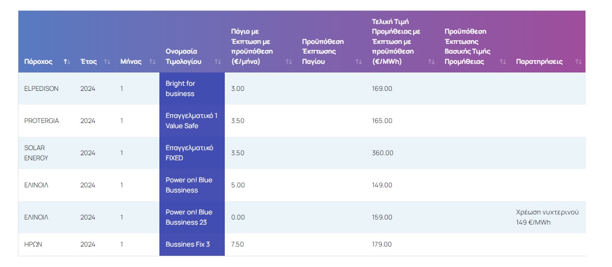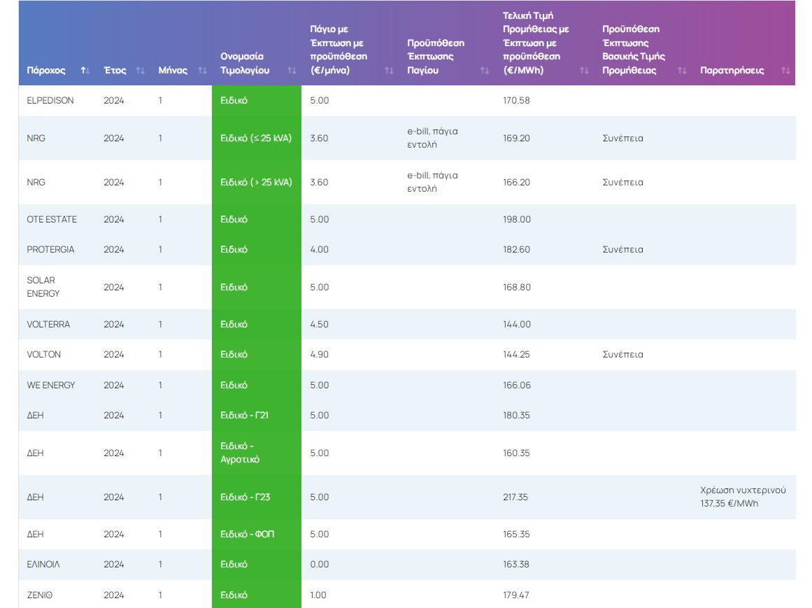Ο κάθε πίνακας περιλαμβάνει την πάγια χρέωση και την τελική τιμή προμήθειας του σχετικού μήνα, κατόπιν υπολογισμού τυχόν εκπτώσεων. Για τη διαφανή ενημέρωση των καταναλωτών, αναγράφεται η προϋπόθεση βάσει της οποίας χορηγείται η εκάστοτε έκπτωση.