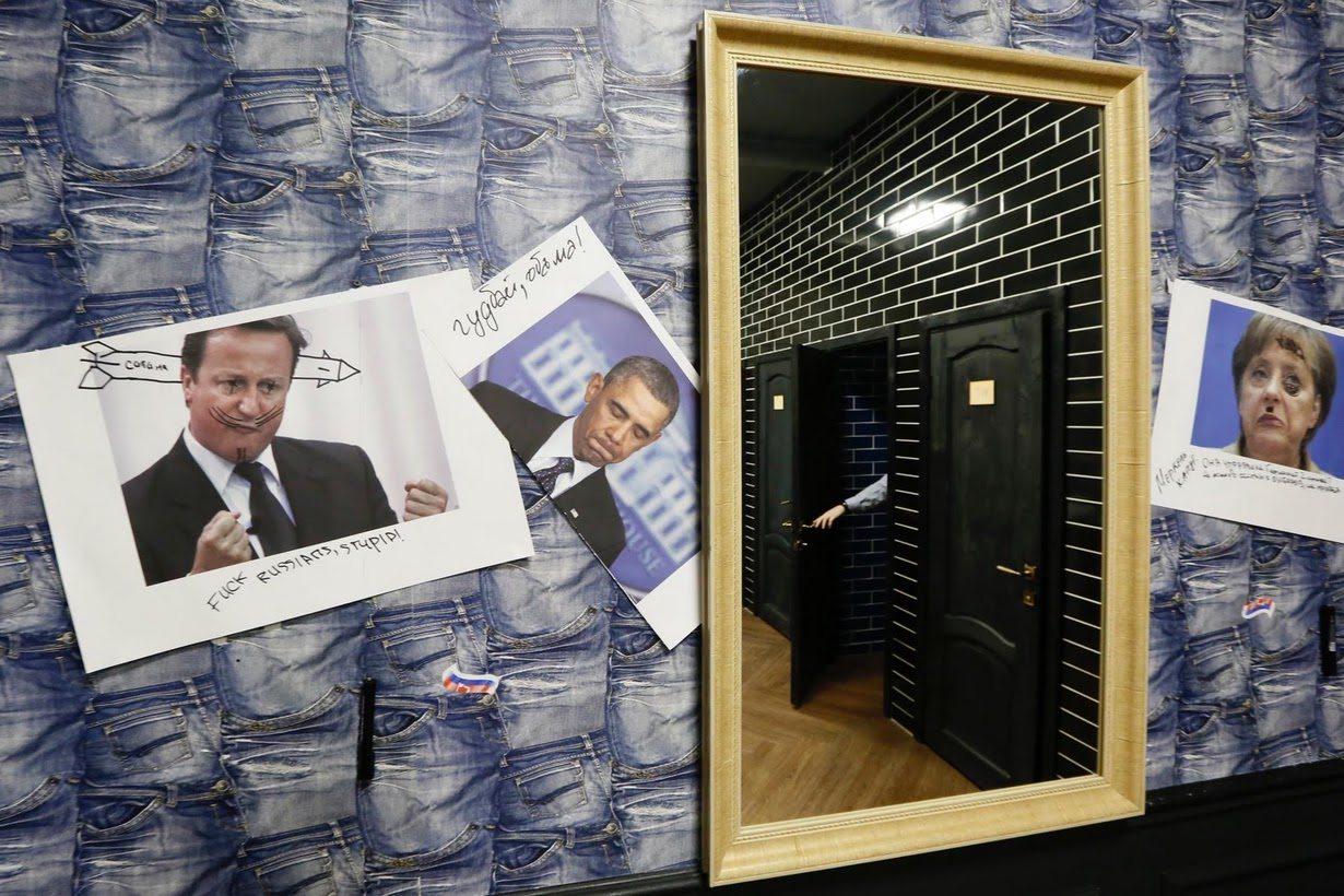 Για να μην ξεχνιόμαστε άλλωστε και για να μπορούν οι πελάτες να εκφράσουν τα αισθήματά τους ελεύθερα, σε μια γωνιά υπάρχει η φωτογραφία του φιλοδυτικού ηγέτη της Ουκρανίας, Αρσένι Γιατσένιουκ, μουτζουρωμένη με βρισιές και κατάρες για τον ύποπτο ρόλο που παίζει «ο προδότης αυτός του ρωσικού λαού».