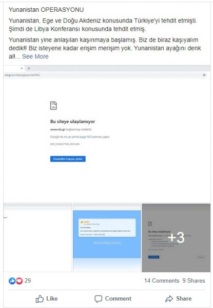 Στο Facebook, σε δική τους σελίδα, έχουν ανεβάσει φωτογραφίες από τις ιστοσελίδες που ισχυρίζονται ότι χτύπησαν.