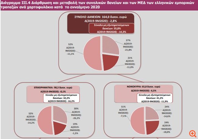 Ο λόγος των μη εξυπηρετούμενων δανείων (ΜΕΔ) προς το σύνολο των δανείων, σημειώνεται, παραμένει πολύ υψηλός, πολλαπλάσιος του ευρωπαϊκού μέσου όρου, ενώ η πανδημία αναμένεται να πλήξει περαιτέρω την ποιότητα των δανειακών χαρτοφυλακίων των τραπεζών.
