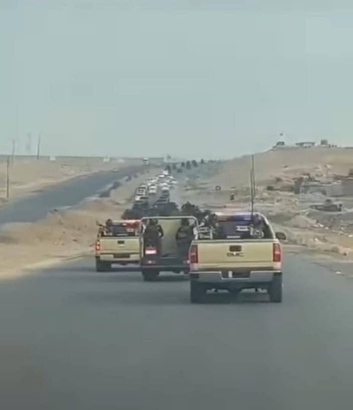 Military column of Iraqi Iranian-supported Shiite PMU forces entering Syria to join Assad’s fight against the Turkish-backed rebels.
